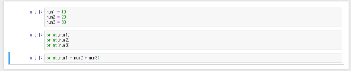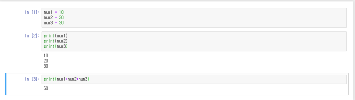 num1 ~ 3까지 선언한 라인( In [1] )을 실행(Run)하지않고 print(num1)라인인 ( In [2] 또는 In [3])을 하게 되면 오류가 납니다.