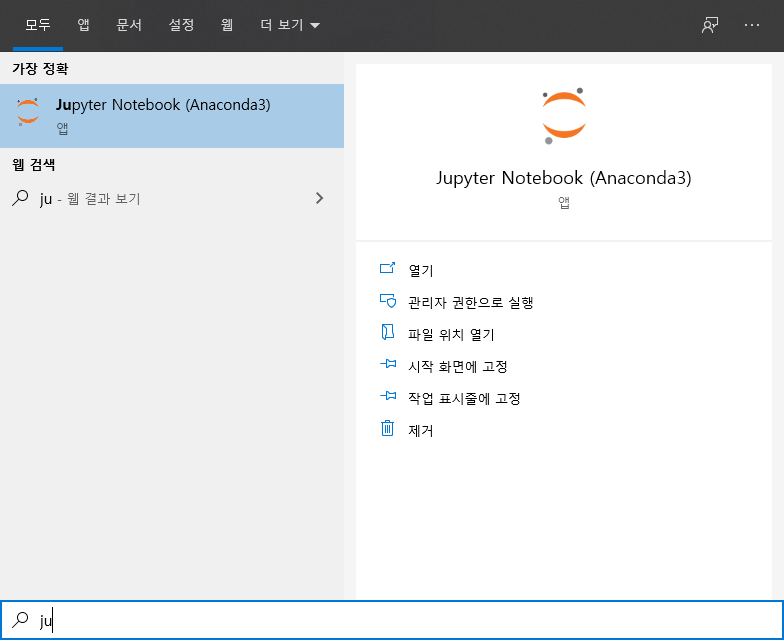 저는 주피터 노트북을 실행할때 아래와 같이 검색해서 실행합니다.