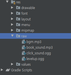우선 리소스폴더내에 raw폴더를 만들고 원하는 배경음악을 넣어줍니다.