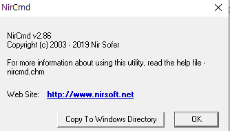 NirCmd v2.86 Copyright (c) 2003 - 2019 Nir Sofer See Also Description NirCmd is a small command-line utility that allows you to do some useful tasks without displaying any user interface. By running NirCmd with simple command-line option, you can wri