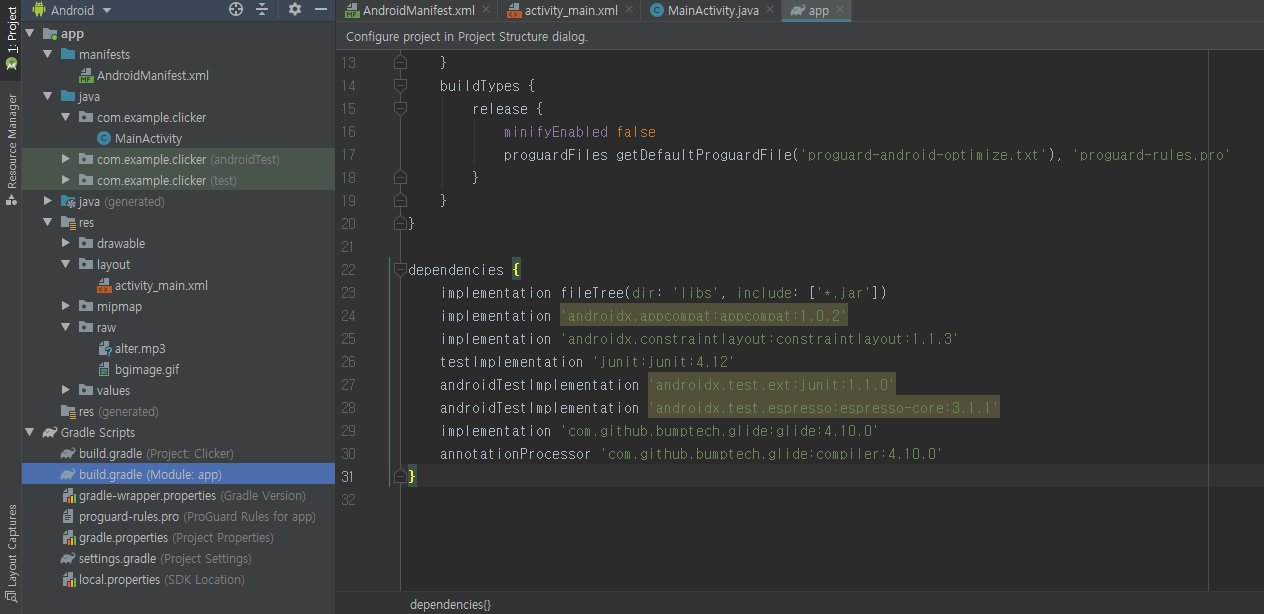 좌측 Gradle Scripts내에 build.gradle (Modult: app)를 열어 dependencies내에 소스를 추가해줍니다.