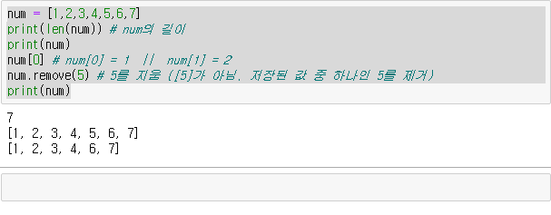 num.remove(5) # 5를 지움 ([5]가 아님. 저장된 값 중 하나인 5를 제거)
