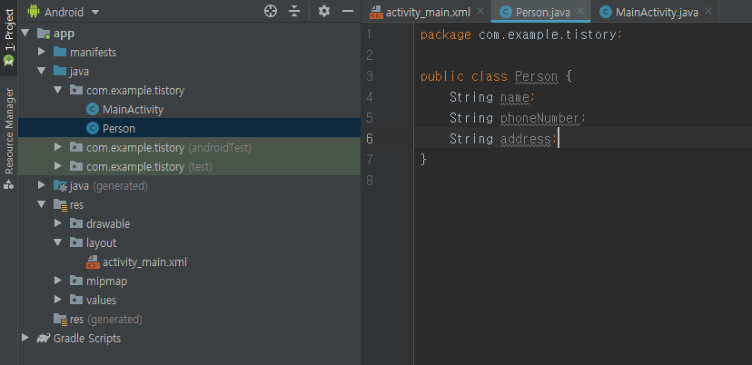 Person이라는 자바 클래스를 만들고 사용할 변수를 선언합니다.