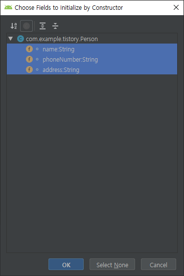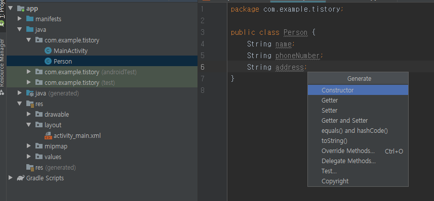 Alt+Insert키를 누르거나 마우스 우클릭으로 Generate를 눌러 Constructor을 클릭합니다.