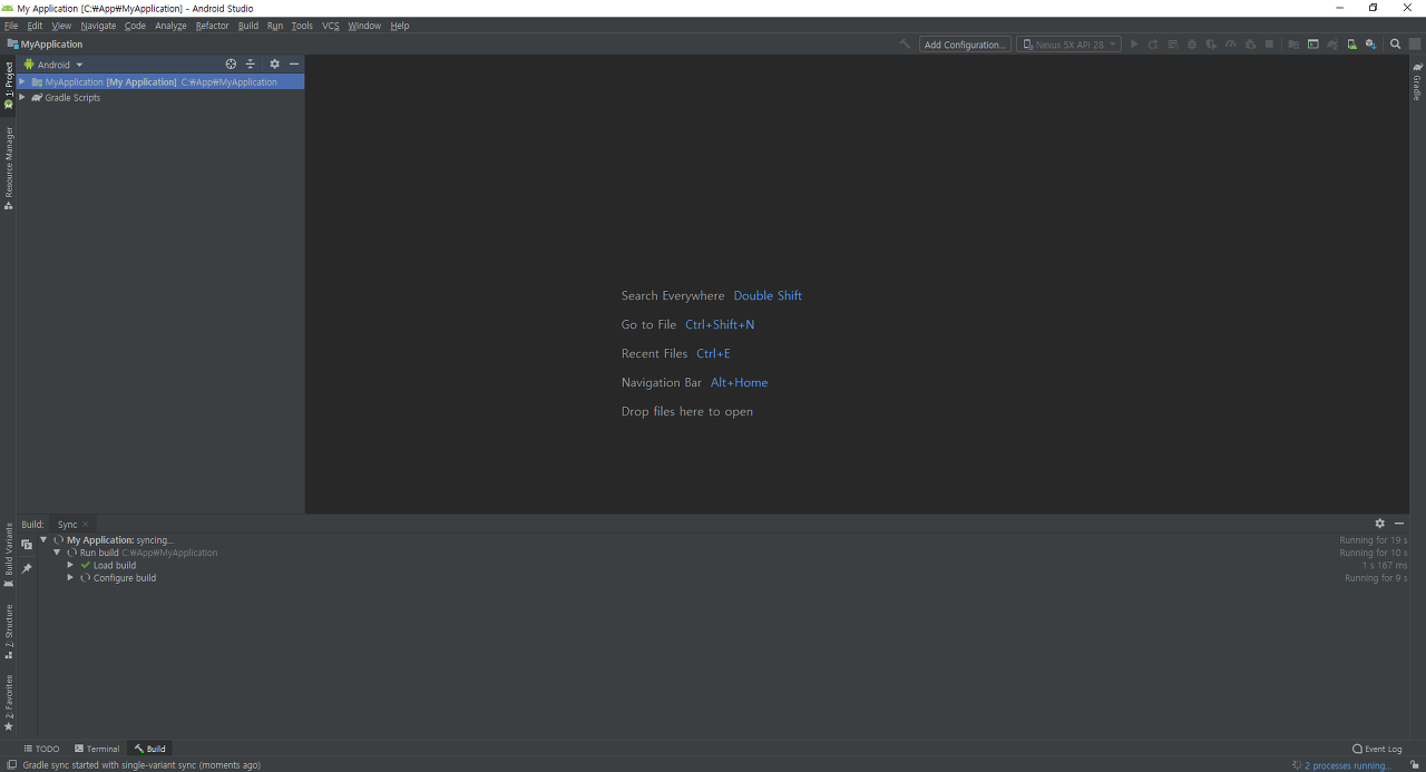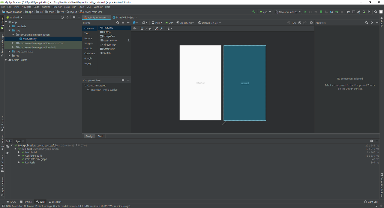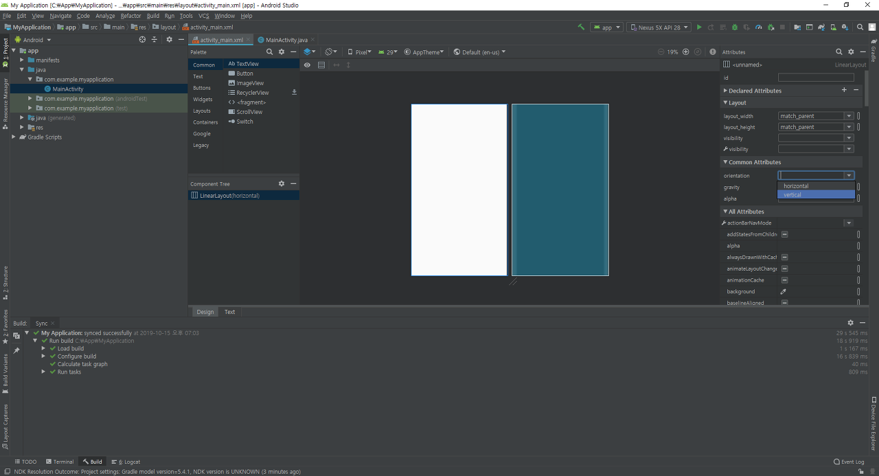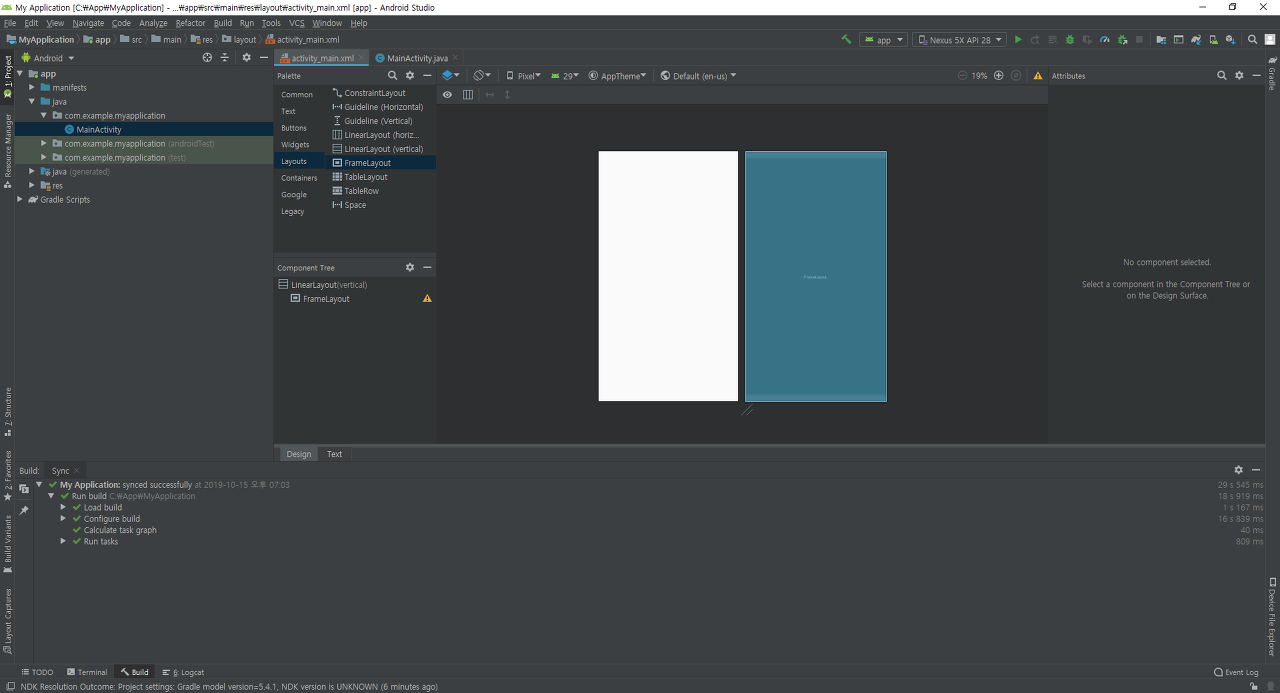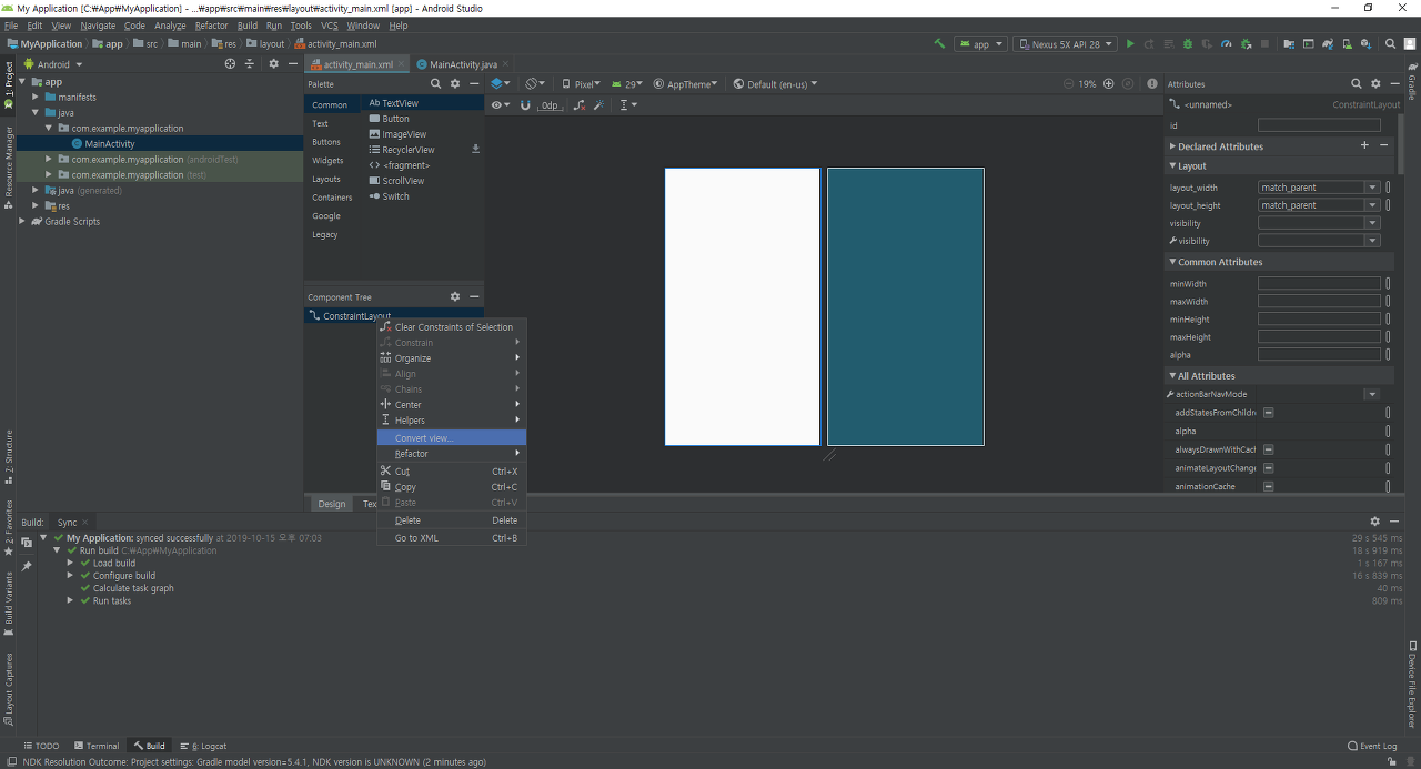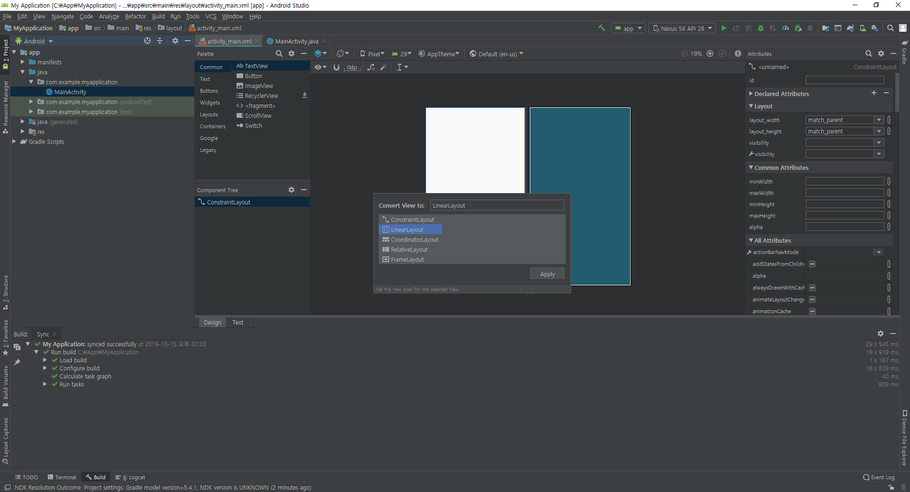 기본 생성되어 있는 텍스트뷰를 지우고 레이아웃을 변경합니다.