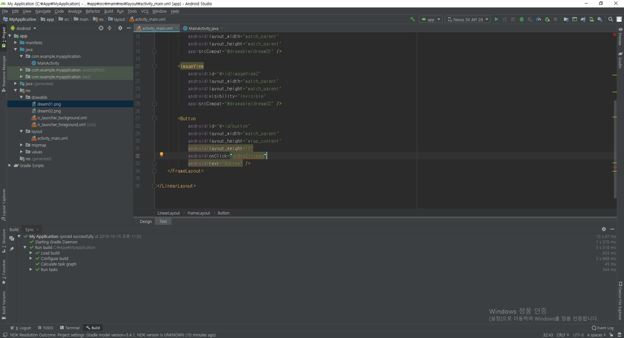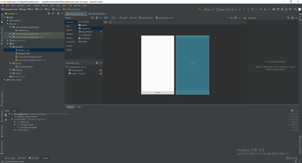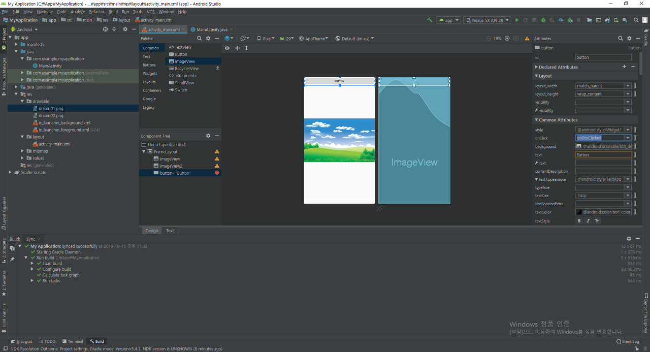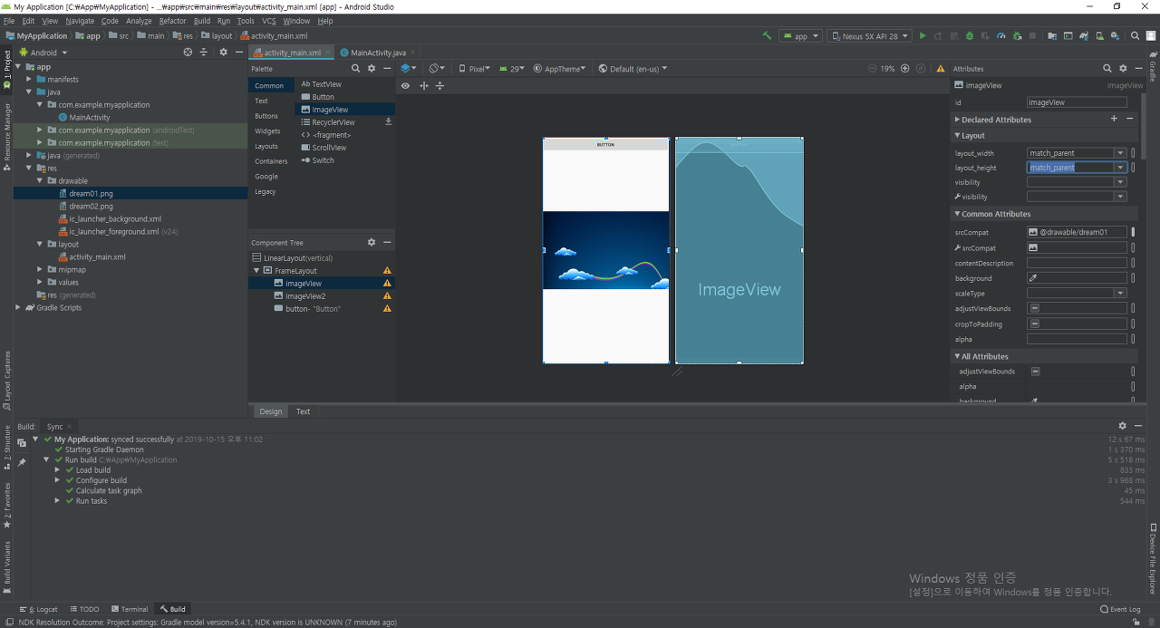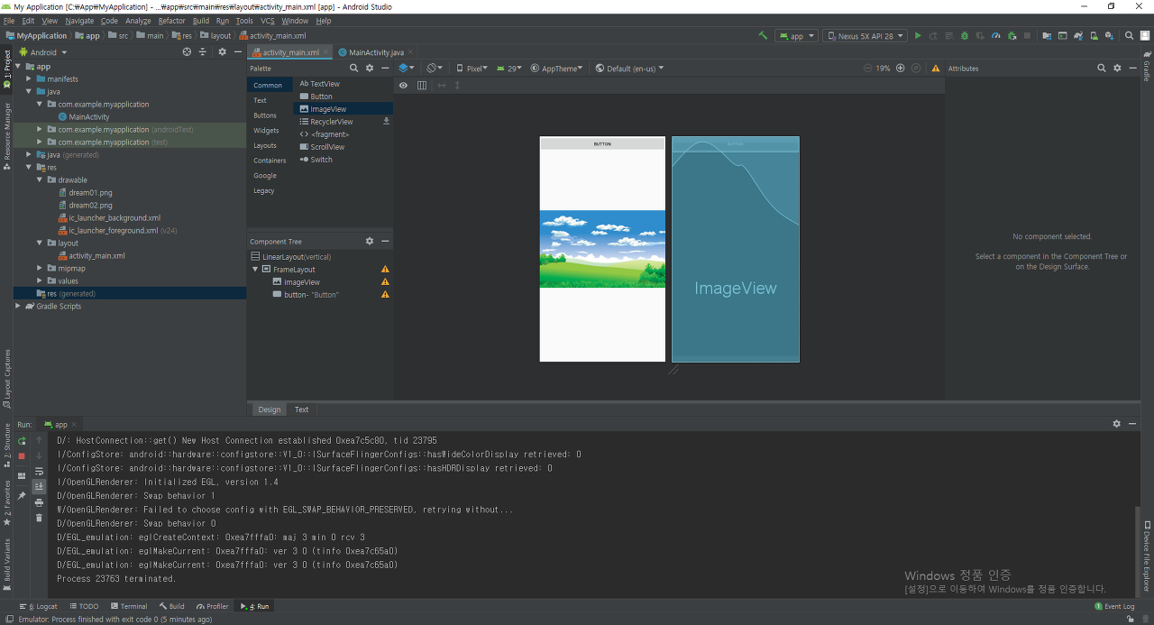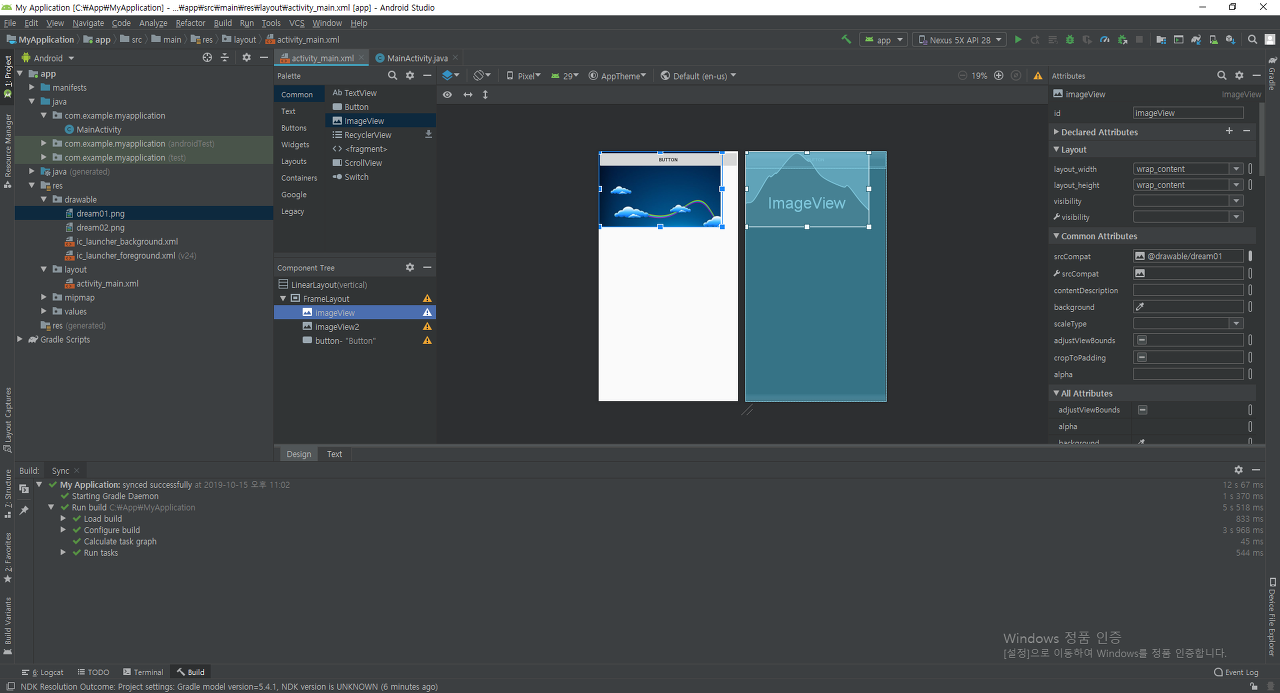 이미지뷰를 프레임레이아웃 아래로 드래그 드랍합니다
