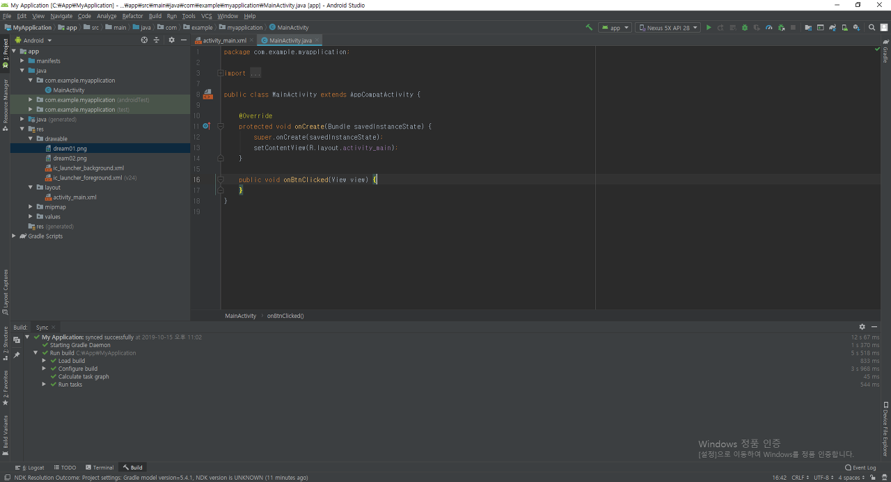 밑으로 내려보면 버튼 속성에 android:onClick="onBtnClicked"부분에