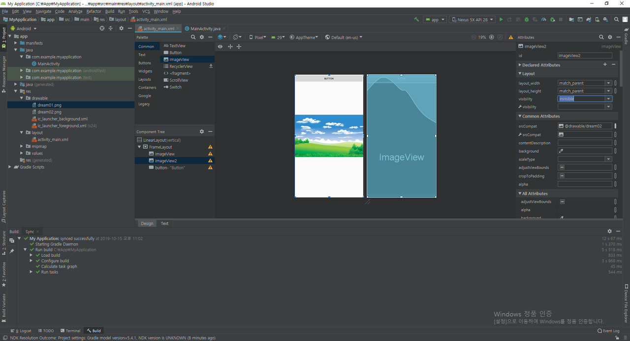 그 다음 이미지뷰2의 visibility속성 값을 invisible로 변경합니다.